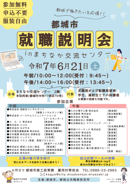 都城市での就職希望者と企業との出会いの場として「都城市就職説明会 in まちなか交流センター」を開催します。気になるブースを訪れて企業の話を直接聞けることはもちろん、厚生労働省job tag<外部リンク>※を使用した、自己診断ツールの体験も行います。