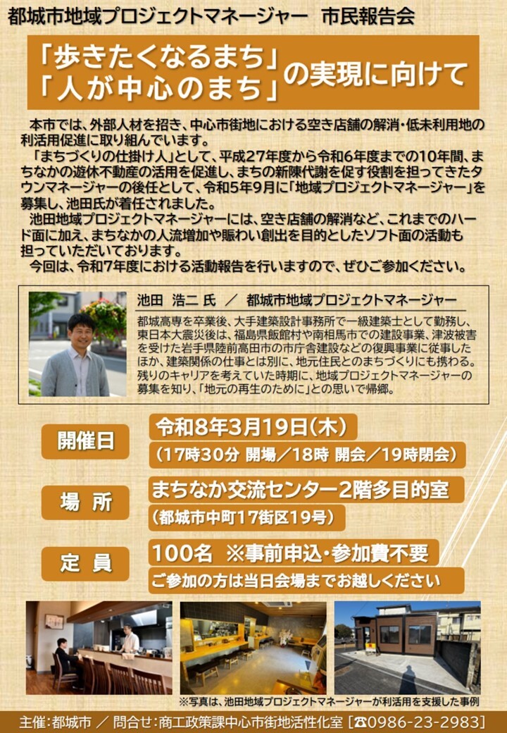 都城市地域プロジェクトマネージャーの市民報告会を開催します。